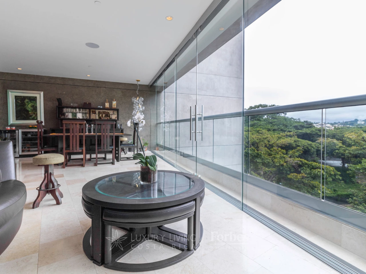 This beautiful and modern apartment is for sale in the exclusive Central Park Trejos Montealegre Condominium. In 340 square meters of living space you will find a large social area, elegant finishes, exquisite details, marble floors, textures on wall, lots of lighting and natural ventilation with floor-to-ceiling windows, large terrace that integrates the exterior area with the interior. This luxury apartment in Escazú also offers fiber optics, 100% LED lighting, expanded kitchen furniture, plus built-in furniture in the living room, master bedroom and additional bedroom. It has curtains, blackouts and built-in mirrors, as well as a sectorized central A / C system and audio system. The kitchen offers stainless steel appliances of excellent quality (Extractor, Double Fridge, Cooker, Microwave and Built-in oven).